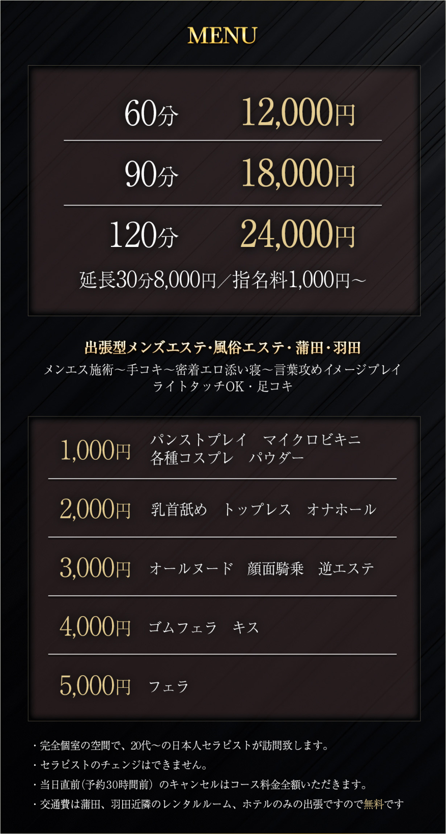 交通費は蒲田・羽田近隣のレンタルルーム・ホテルのみの出張ですので無料です